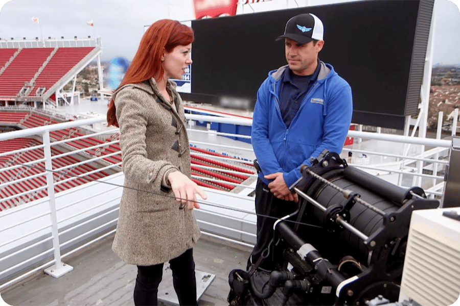 Now, the rope that supports this 50-pound camera rig is actually only 0.1 inches in diameter. Still, each individual line is capable of supporting 600 pounds of weight, allowing the camera to reach speeds of up to 30 MPH during the game.